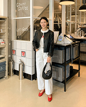 轻盈柔软的面料,时尚百搭,随时随地都能轻松穿搭。表面泛着淡淡的光泽。干爽圆领皮革外套。