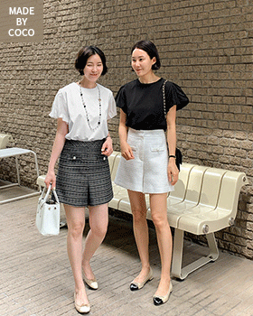 自产的粗纺短裤,长度适中,修饰腿部线条,并饰以精致的珍珠线,营造出更加奢华的氛围。
